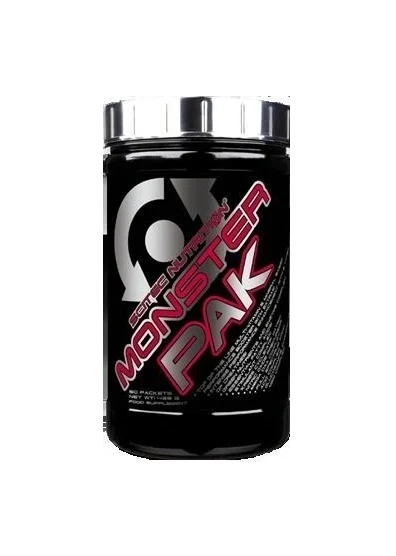 Monster Pak (от Scitec Nutrition) — это «пак»-система дневного рациона из двух пакетиков (A + B) с витаминами, минералами, аминокислотами, жирными кислотами и функциональными матрицами для производительности и восстановления. Пакет A содержит стимуляторы и аминокислоты, пакет B — рыбий жир (омега-3) и суставной блок. Формула включает высокие дозы витаминов группы B и витамина C, а также NO-прекурсор L-аргинин. Есть «Krebs cycle–ATP» матрица (креатиновые формы, бета-аланин, Q10 и др.) и Mega DAA-комплекс. Формат «саше» упрощает приём: всё дозировано и разделено на части дня. 40 паков = 20 полных суточных порций.