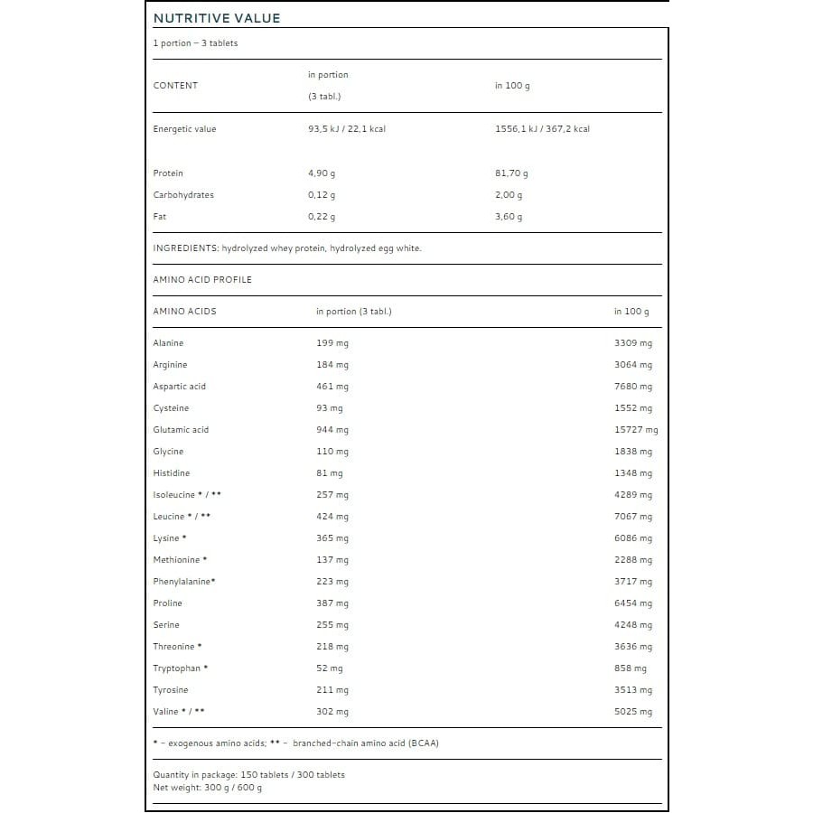 - Одна таблетка содержит 1633 мг аминокислот;