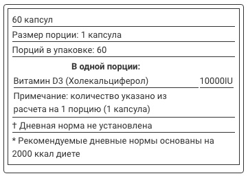 Принимайте Витамин D3 по 1 капсуле 1 раз в день (10000 МЕ в сутки). Дозировка 10000 — самая высокая дозировка, обычно назначается врачом при сильном дефиците этого витамина. После курса (около 4-ех недель рекомендуется повторить анализ)