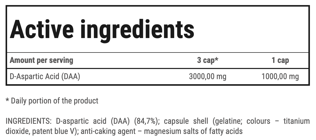 DAA Ultra — это натуральный модулятор синтеза эндогенного тестостерона, содержащий D-аспарагиновую кислоту фармацевтического качества, которая играет важную роль в функционировании нервной системы и желез внутренней секреции.