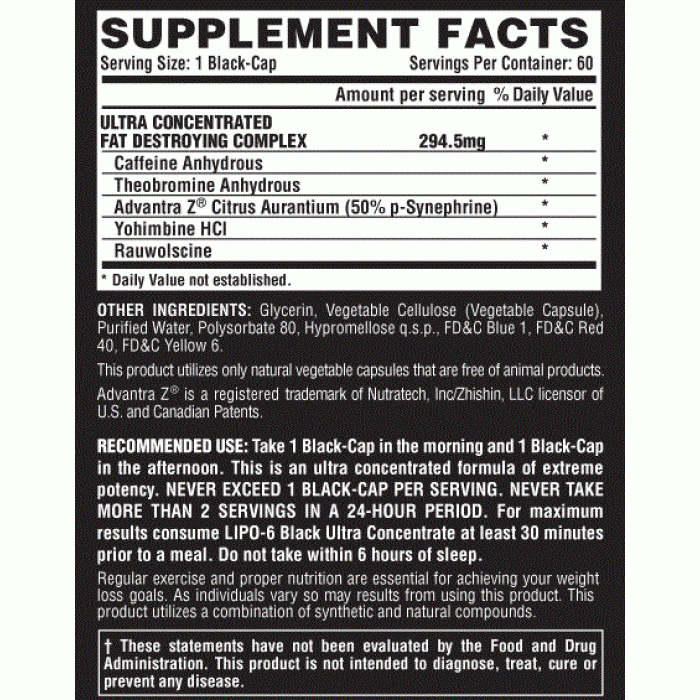 Принимайте по 1 капсуле утром и 1 капсулу около полудня. Никогда не превышайте дозировку 2 капсулы в сутки. Не следует принимать во время еды. Принимайте по меньшей мере за 30 минут до еды, кроме того, Lipo 6 Black необходимо принимать циклами.