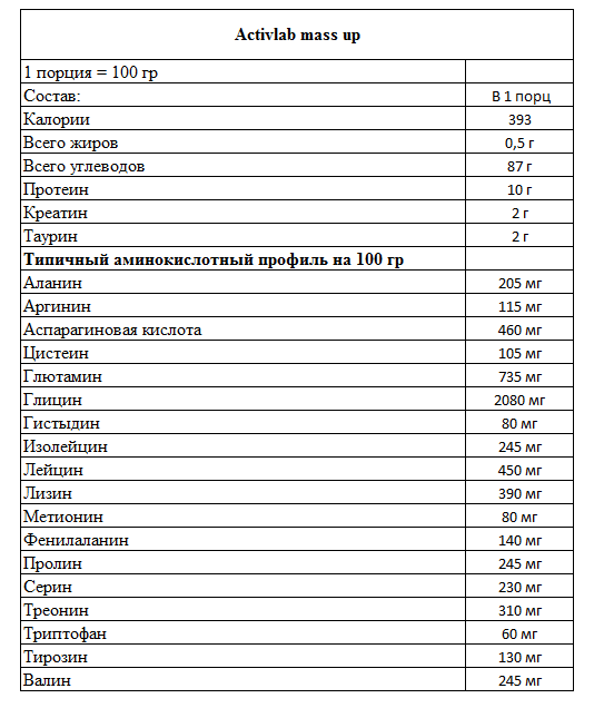 Mass Up ActivLab – среднекалорийный гейнер премиум класса с акцентом на углеводах. Производитель предлагает легко и просто восполнить энергетические потребности организма. Весь состав опирается в основном на углеводы. Регулярный прием Mass Up позволит заметно упростить рацион, и при этом получить желаемый массанаборный эффект. Использовать данный гейнерный комплекс нужно только при наборе мышечной массы, причем «плато» — не является обязательным условием к применению. Употребление гейнера ускорит текущий прогресс буквально на глазах, ведь количество, и в частности избыток килокалорий является одним из ключевых условий набора мышц.